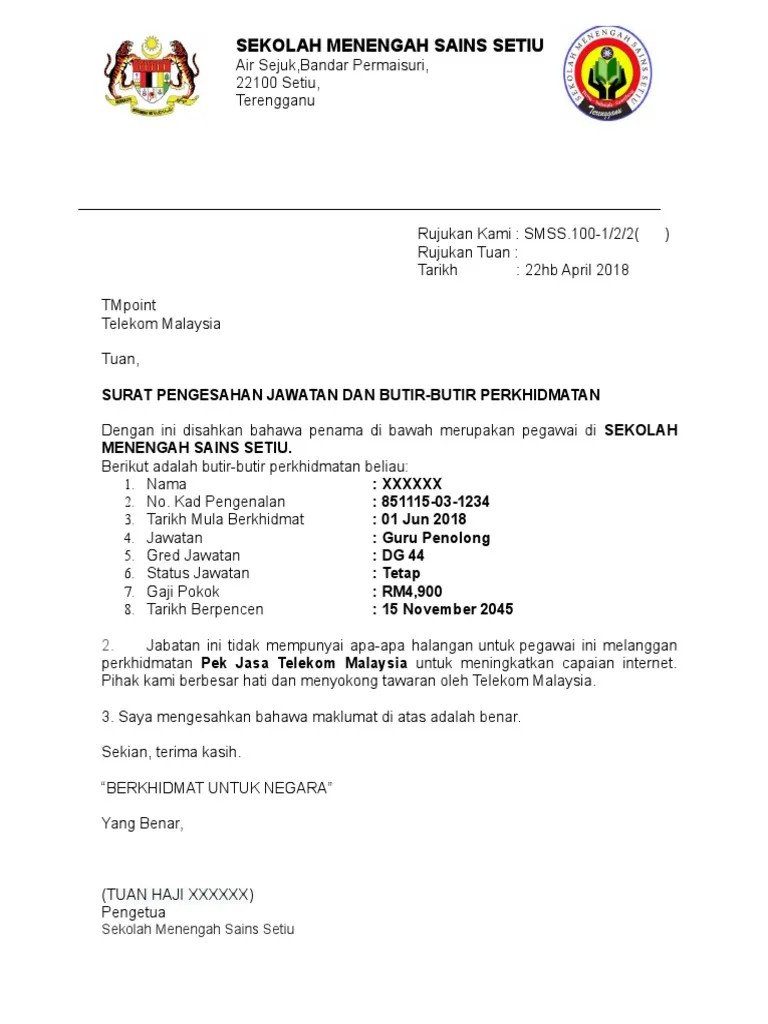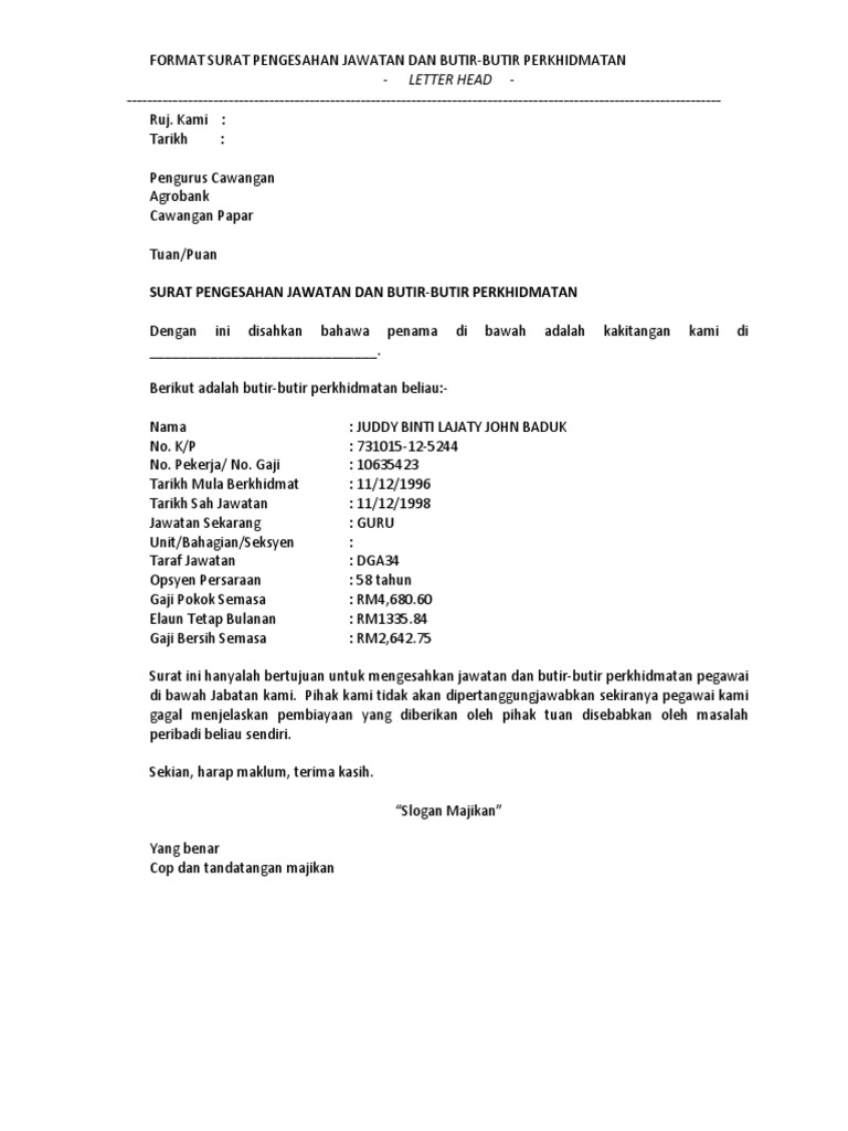 Selain itu, ada 20 contoh surat permohonan yang dapat dijadikan acuan untuk mempermudah pengerjaan surat tersebut. Home » contoh surat » contoh surat tunjuk sebab majikan dan pekerja. Berikut dikongsikan contoh surat pengesahan majikan dan juga surat pengesahan jawatan buat panduan semua. Surat pengesahan majikan sangat penting untuk sebarang urusan rasmi seperti loan bank serta membuat pinjaman bank. Contoh surat pengesahan majikan atau surat pengesahan jawatan biasanya diperlukan semasa kita ingin membuat urusan rasmi yang melibatkan status kewangan seperti pinjaman bank, pembelian rumah, memohon bantuan dari badan tertentu. Surat tersebut memaparkan maklumat pekerja, jumlah gaji, jawatan, tempoh perkhidmatan dan sebagainya. Maksud surat pengesahan majikan ni adalah surat yang mengesahkan bahawa pekerja tersebut bekerja di syarikat berkenaan. Contoh surat pinjaman contoh surat pinjaman untuk anda yang sedang mencari contoh surat pinjaman di bawah ini akan dicontohkan beberapa surat contoh surat pengesahan majikan untuk pegawai kerajaan. Contoh surat pengesahan majikan dan jawatan ringkas mudah. Contoh surat permohonan izin tidak masuk sekolah. Contoh surat pengesahan pendapatan bagi individu yang tidak mempunyai slip gaji. Salvarsalvar contoh surat pengesahan majikan epsa 2018 para ler mais tarde. Lowongan kerja cpns 2018, format terbaru contoh surat lamaran cpns kementerian hukum dan ham, surat lamaran penjaga tahanan, surat pernyataan tenaga sipir, surat pernyataan cpns kemenkumham.
