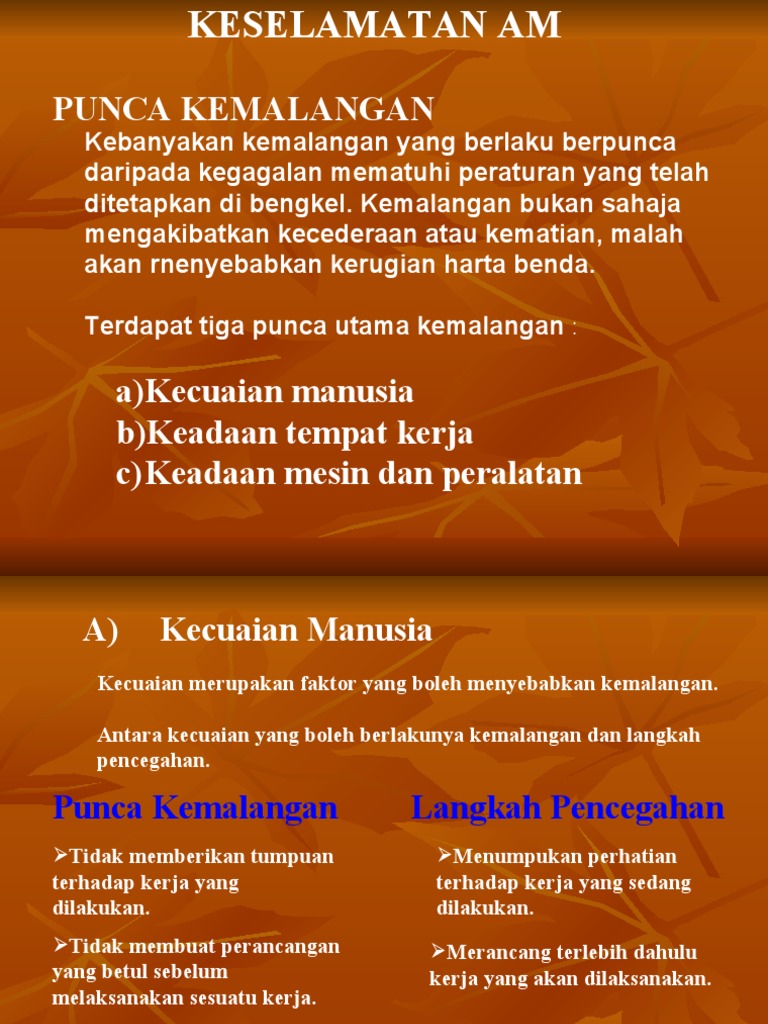 Kemalangan adalah sesuatu yang kompleks dan berlaku tanpa dirancang, namun ia boleh dicegah. • tindakan yang tidak selamat (unsafe act) • keadaan kerja tidak selamat (unsafe condition). Menjaga agar tempat kerja tetap aman adalah tugas semua pihak. Kemalangan di bukit tujuh kemalangan di kilang sawit. Pampasan terbahagi kepada beberapa jenis iaitu