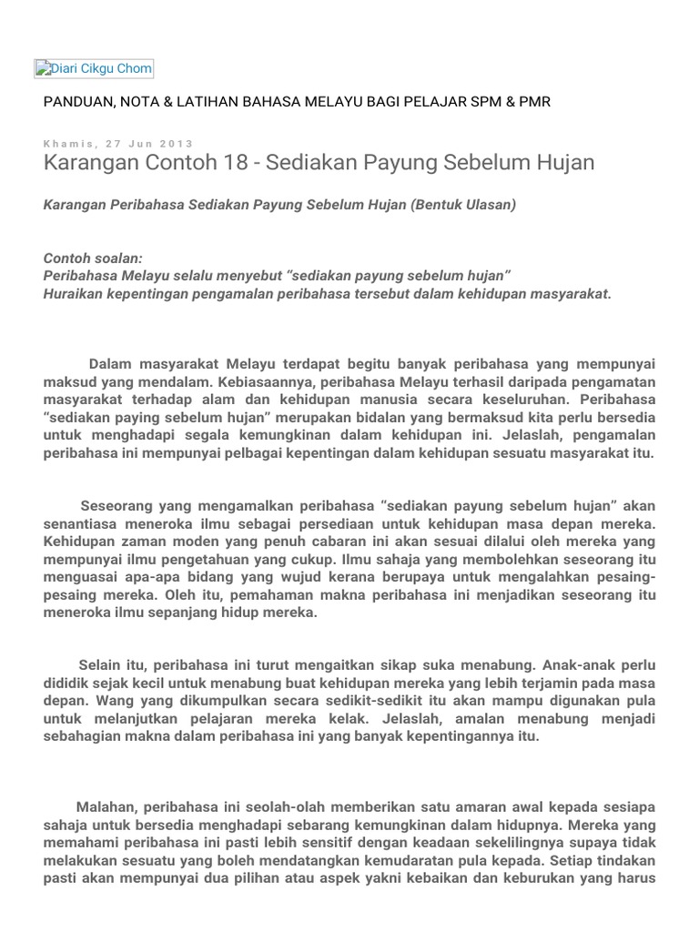 Mana aku mendapat wang sebanyak itu.aku hanya tersenyum seraya memberitahu mereka bahawa semua duit yang aku peroleh selama ini, aku simpan kerana aku berpegang pada peribahasa sediakan payung, sebelum hujan.kulihat mereka terkesima. Peribahasa sedia payung sebelum hujan mungkin sudah tidak asing di telinga masyarakat indonesia. You might also like more from author. Secara tuntas, saya berharap para pelajar dapat belajar menulis karangan dengan baik. Senarai peribahasa dalam buku teks tingkatan 5.