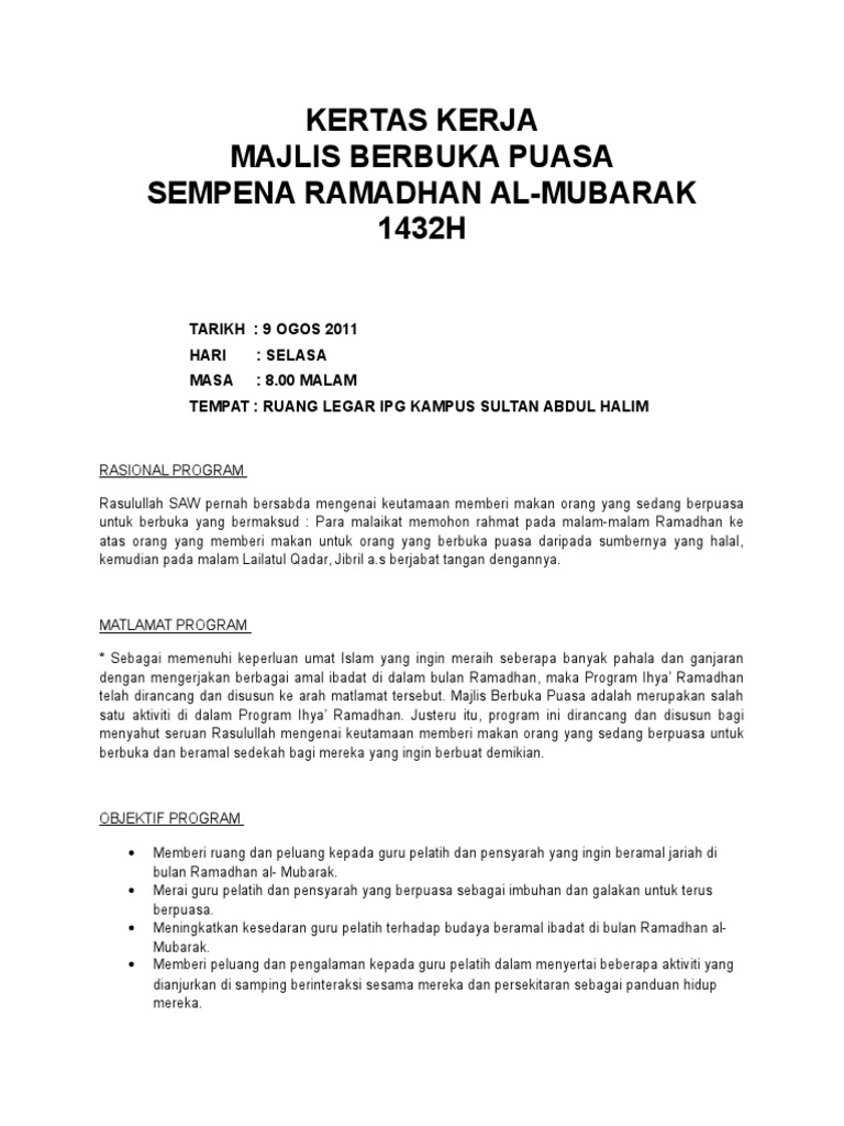 Related : Kertas Kerja Majlis Berbuka Puasa - Kertas Kerja Program Berbuka Puasa Bersama Anak Yatim Wordsneptun - Smra jempol, 72100 bahau, negeri sembilan nama program majlis iftar jamitarikh :.