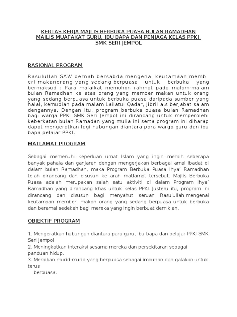 Kertas Kerja Majlis Berbuka Puasa - Kertas Kerja Program Berbuka Puasa Bersama Anak Yatim Wordsneptun - Smra jempol, 72100 bahau, negeri sembilan nama program majlis iftar jamitarikh :. Yang sinonim dengan amalan kemasyarakatan turut mengambil peluang melalui satu program. Dengan memberikan ucapan selamat berbuka puasa, kamu sama saja membagikan energi positif untuk selalu semangat menjalani bulan suci ini. Akta keselamatan sosial pekerjaan sendiri 2017 (akta 789). Majlis diteruskan lagi dengan pembentangan kertas kerja teknik pembelajaran bestari subjek adab dan nusus pada jam 2.30 petang. .kertas kerja majlis iftar perdana sesi 2012 asrama smk gerik kertas kerja majlis berbuka puasa sesi 2012 1.
